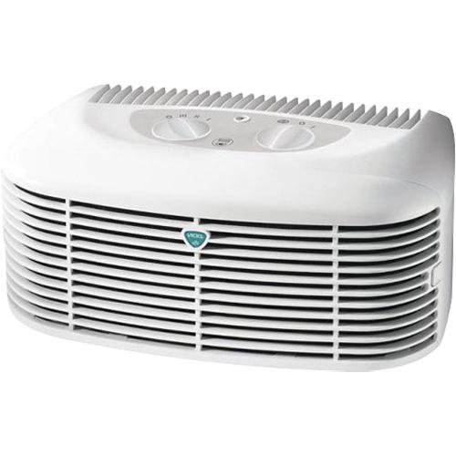 The V9071 HEPA air purifier is 99% efficient at reducing airborne particles such as dust, tobacco smoke, pollen, cat dander and mold spores from the air that passes through it. Plus, the independently controlled ionizer delivers extra cleaning power and helps freshen the air. An electronic filter indicator illuminates to remind you when to replace the filter. This compact air purifier fits great on a tabletop and is ideal for nursery, playrooms, children's rooms and smaller living spaces. Recommended for small rooms (10' x 10'). Recommended room size 10' x 10' (110 sq. ft.) AHAM CADR Rating - 70